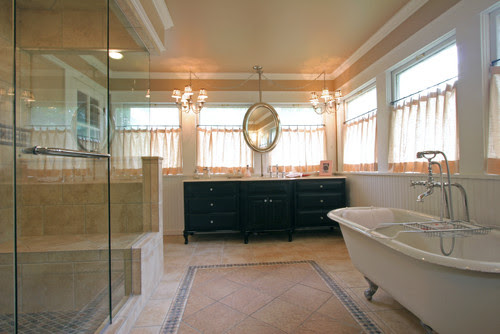 Here's another great example of a traditional bath with an oval mirror hung in front of the window. Simple is good.