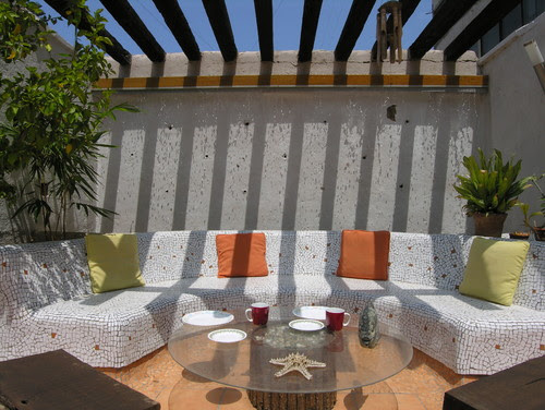 1. Add a built-in mosaic bench. This gorgeous built-in mosaic bench reminds me of the whimsical designs of Spanish architect Antoni Gaudí in Barcelona. A piece like this would be a welcome change from standard backyard furniture that needs to be protected from rain and snow.