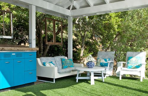 The fiberglass sofa is from the 1960s and originally was on a yacht. When crafting a layered roof that let in the breeze but kept out the rain blew the budget, Ggem made up the difference with fabric. “These are some of the most inexpensive ready-made cushions on the market,” she says. “We thought they’d be a place filler, but they seem to be here to stay.” The throw pillows are from Cost Plus World Market.